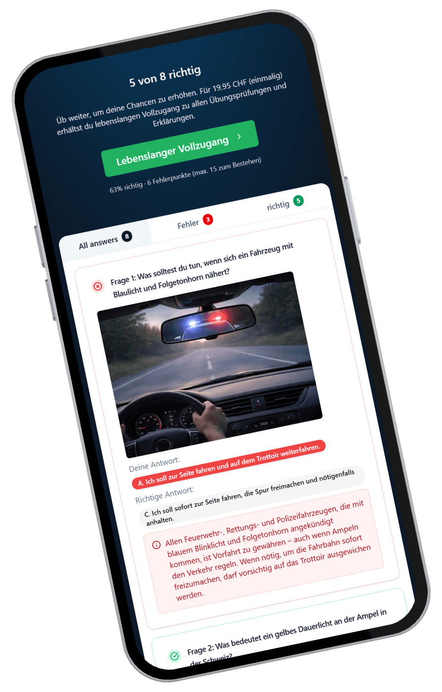Übe mit schweizerischen Prüfungsfragen, versteh die Regeln statt zu raten, und werd prüfungsreif – mit klarem Lernfortschritt.