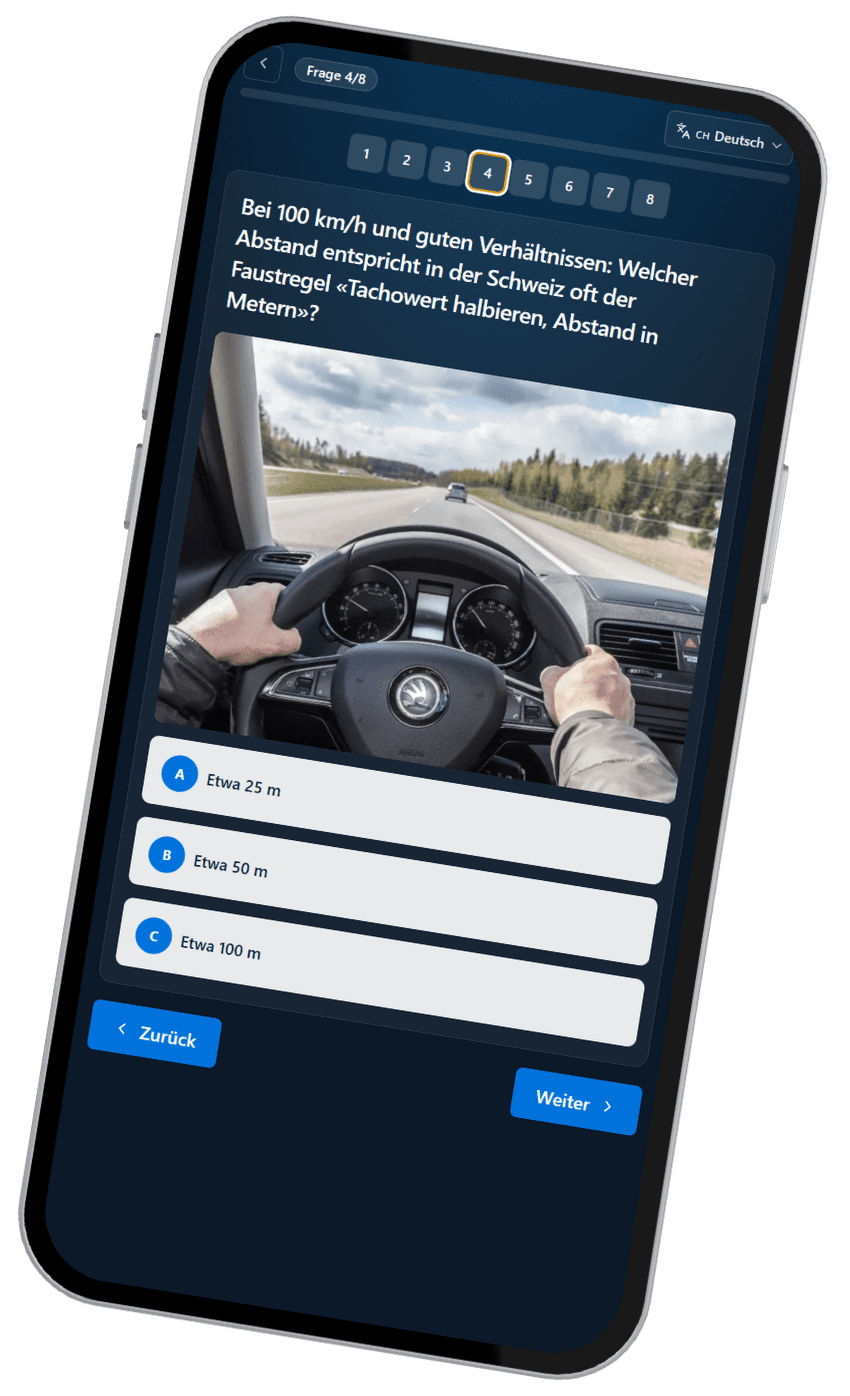 Bereite dich auf die Auto-Theorieprüfung mit Videos und Prüfungssimulationen vor – im schweizerischen Prüfungsstil.